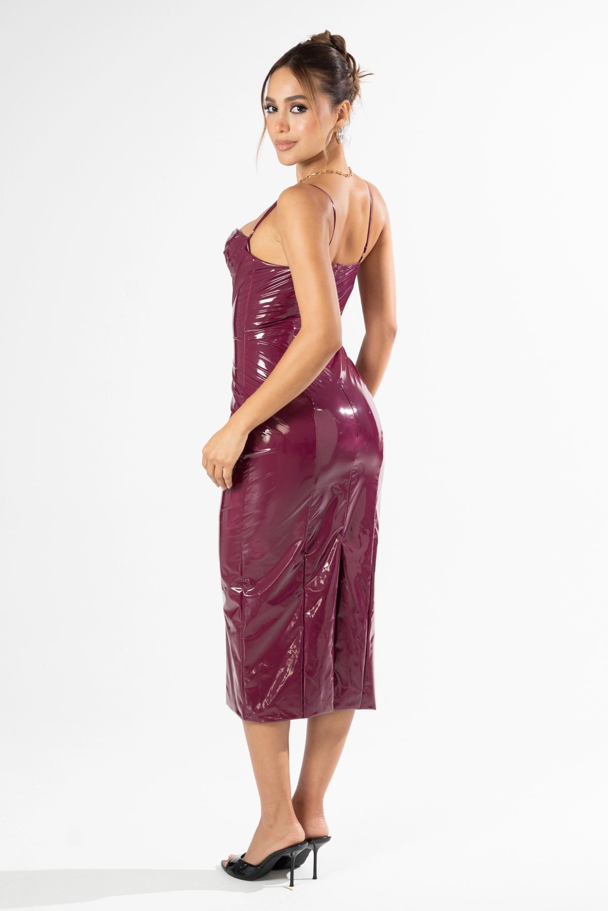 Learn MoreCommand the room in the Jayne Maxi Dress, a high-shine statement piece that blends modern edge with classic glamour. This stunning midi-to-maxi gown features a sleek, liquid-look finish in a rich burgundy shade. With its structured corset bodice and thin spaghetti straps, it is designed to highlight your curves and provide a bold, polished look for your next big event.